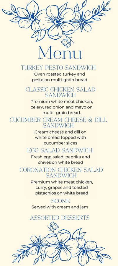 Each guest receives five finger sandwiches, one scone, three mini desserts and one pot of tea. Our children's version includes kid-friendly sandwiches and is served with a scone, three mini desserts and fairy water.